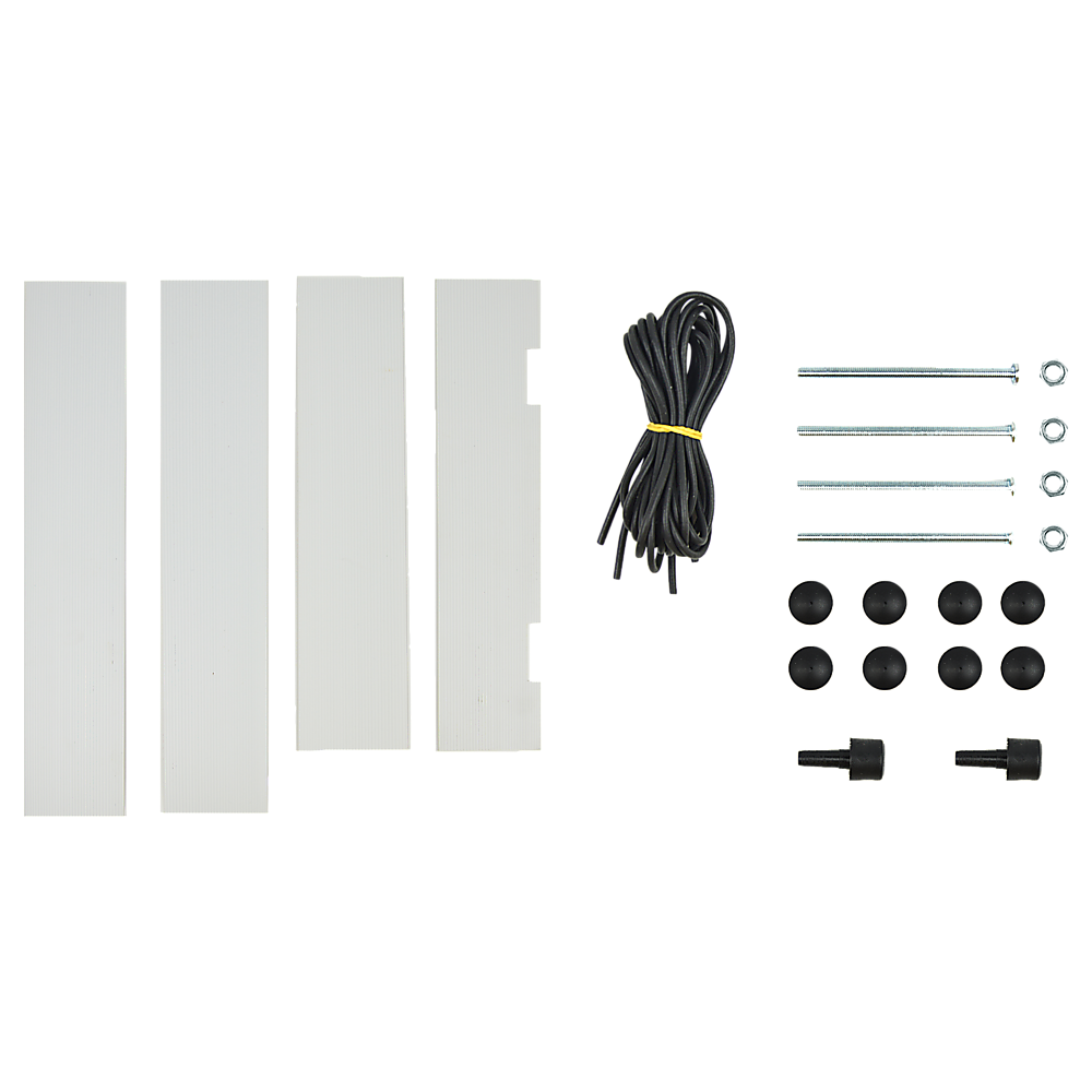 Contents: 2 strings, 4 baffles, 4 screws and caps, 1 large two-way locking pet door and panel